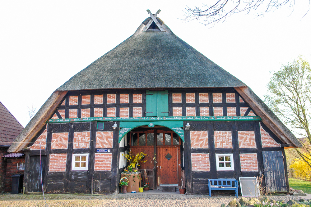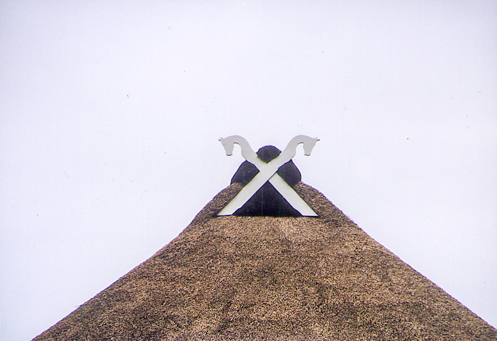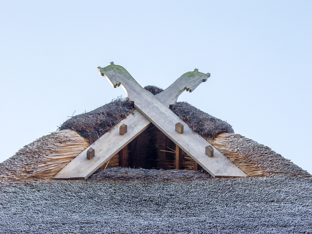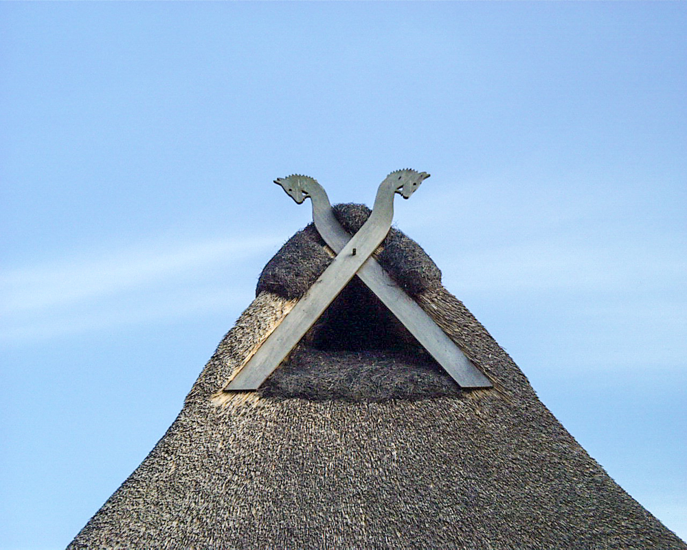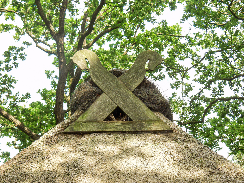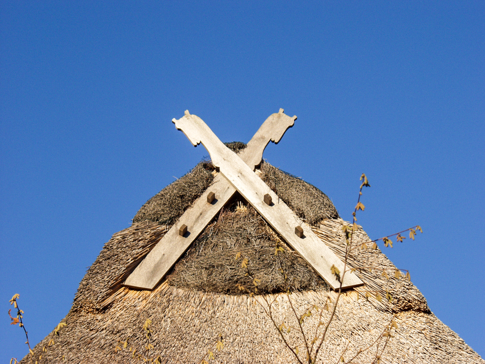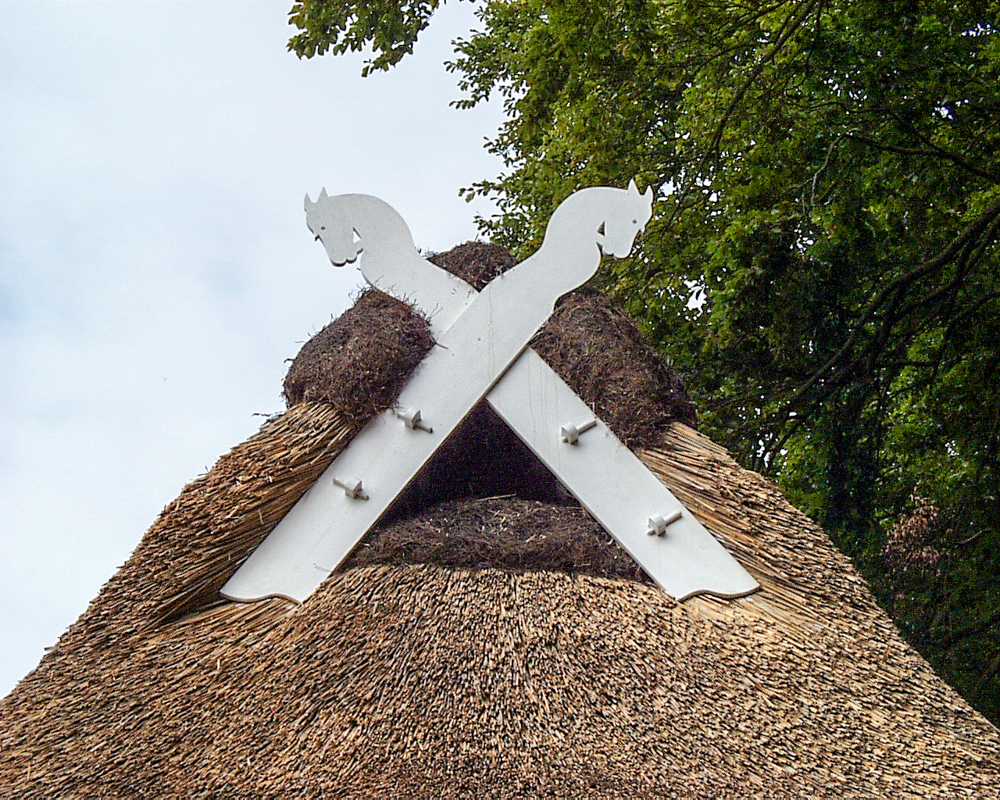 Pferdeköpfe am Bauernhaus sind nicht nur schmückendes Beiwerk, sondern schützen auch den empfindlichen Dachabschluss vor der Witterung. Das entstehende Dreieck bildet das sogenannte Uhlenloch und wird meistens verglast oder anderweitig geschlossen.