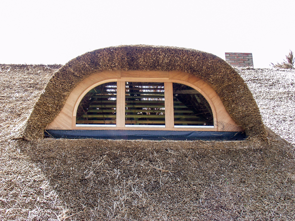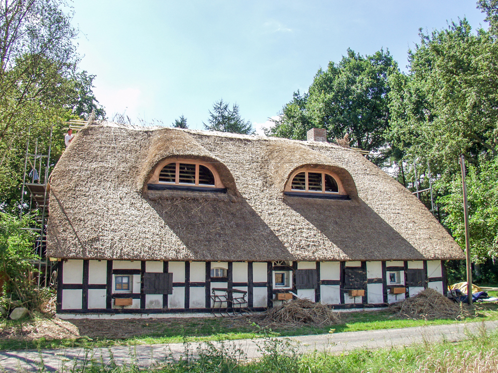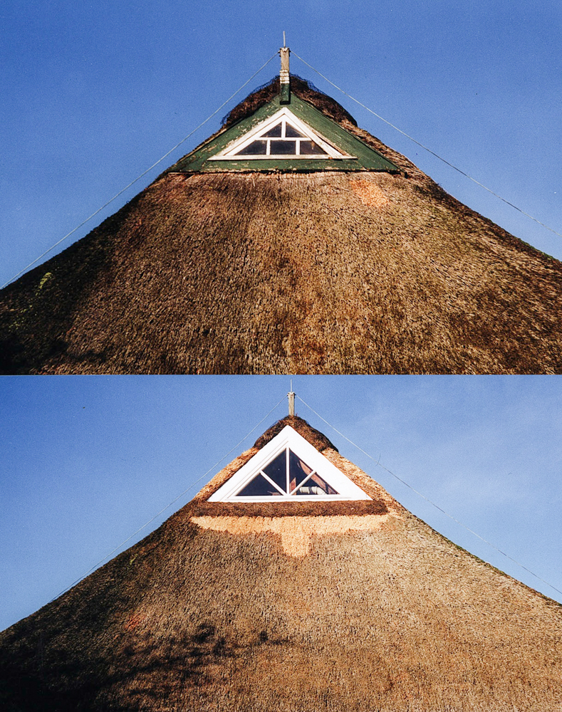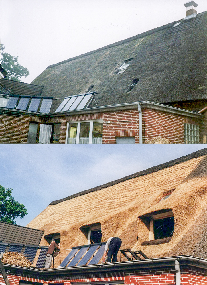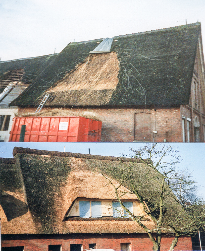 Das heißt, man entfernt die alte Reetschicht, und falls nötig werden Dachstuhl und Dachlattung repariert. Auch Wind- u. Traufbretter werden bei Bedarf ausgewechselt.