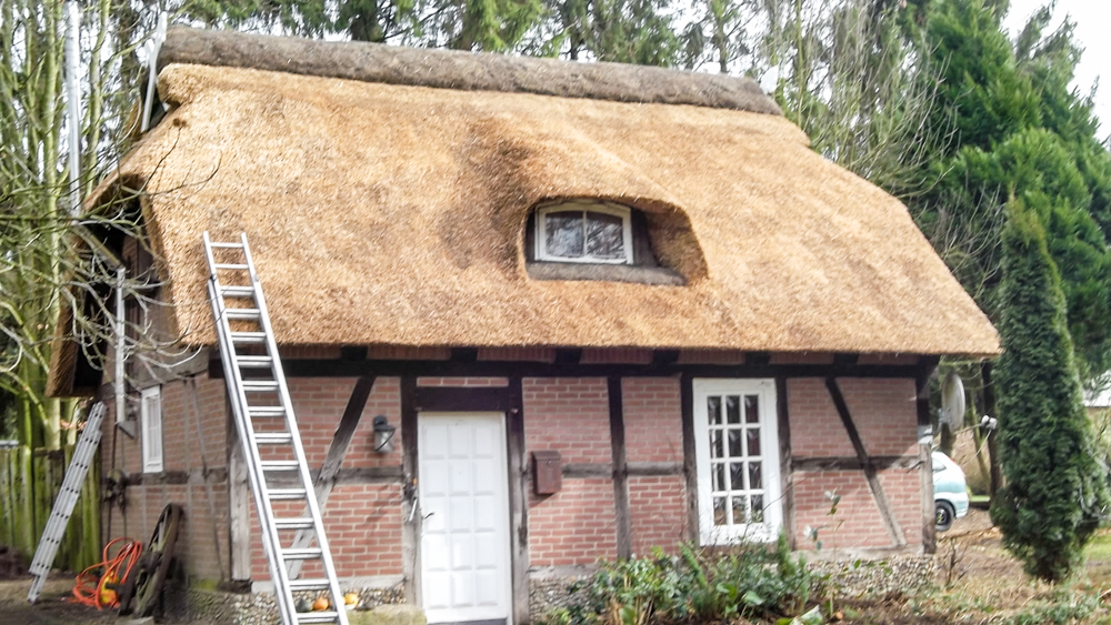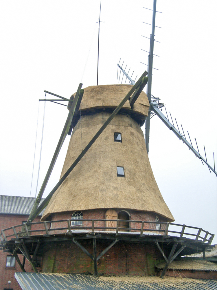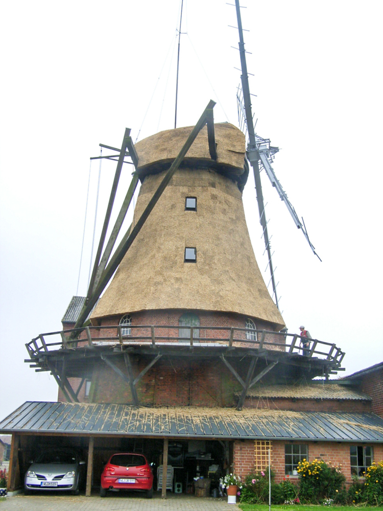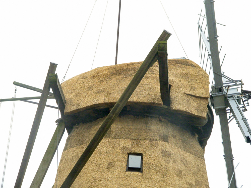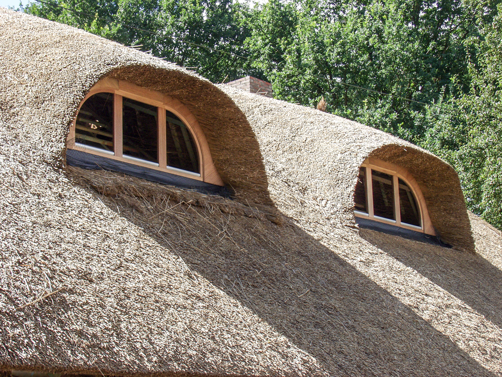 Das heißt, man entfernt die alte Reetschicht, und falls nötig werden Dachstuhl und Dachlattung repariert. Auch Wind- u. Traufbretter werden bei Bedarf ausgewechselt.