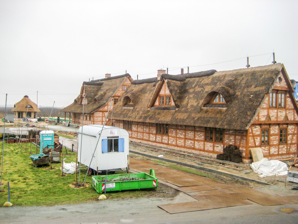 Das Dach ist nun fertig. Es leuchtet noch gelb mit dem frischen Reet. Das wird sich aber bald ändern, Sonne und Regen sorgen für die silbergraue Farbe die es mit der Umgebung verschmelzen lässt.
