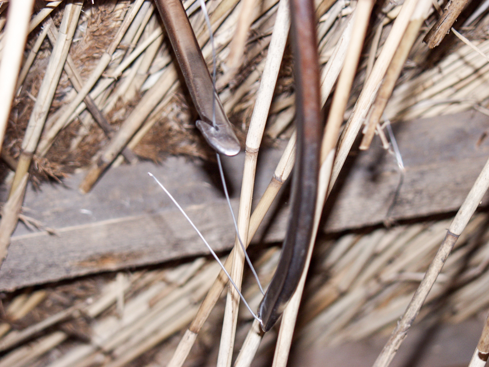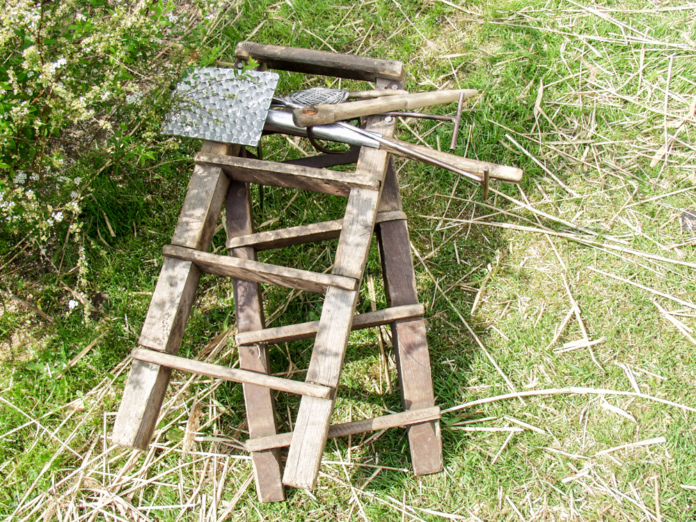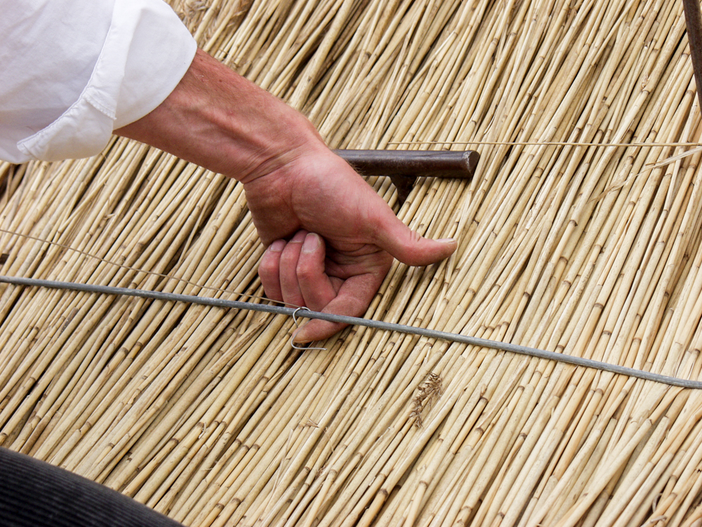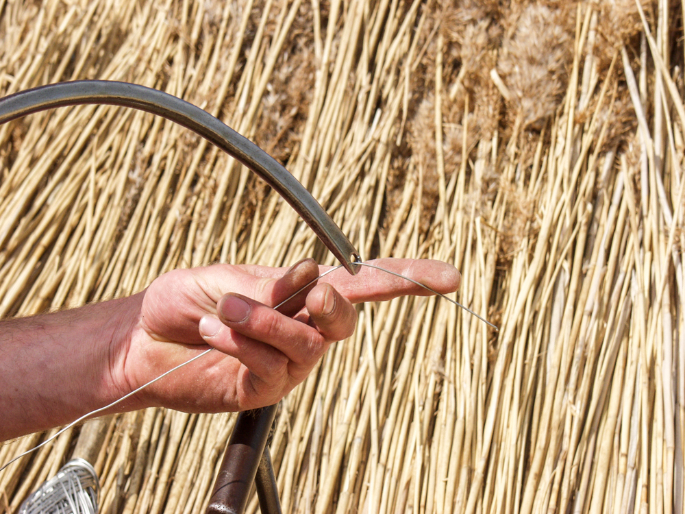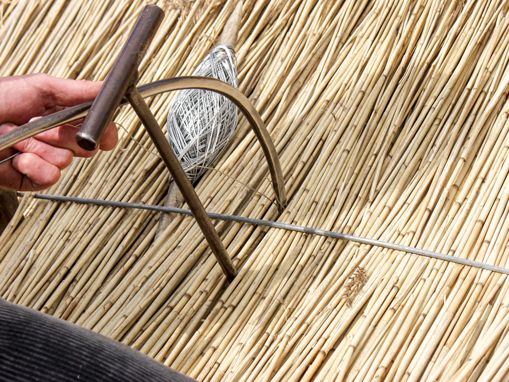 Wir benutzen immer noch die traditionellen Werkzeuge, wie Nähnadeln (rund und gerade), das Klopfbrett, den Knecht (Haken zum fixieren von Reet und Draht), und den Deckstuhl (kurze Leiter, die ins Reet gehängt wird). Lediglich das Materiel aus dem die Werkzeuge und Hilfsmittel gefertigt werden, hat sich geändert: von Eisen und Holz zu Aluminium und Edelstahl.